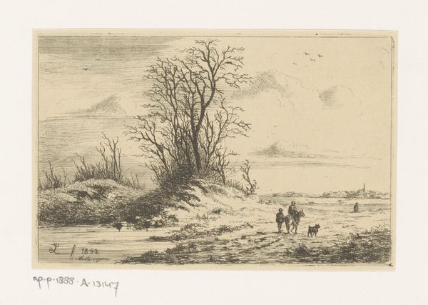 Editor: Here we have Jean Théodore Joseph Linnig’s 1852 etching, "Winterlandschap bij Beert." The scene feels bleak but there's also a strange beauty to its starkness. What catches your eye about this work? Curator: The etching’s strength lies in its delicate rendering of texture and light. Observe how Linnig uses varied densities of lines to describe the subtle gradations of the sky, contrasting the dense thicket on the left with the skeletal trees in the foreground. This manipulation of the medium – the very essence of the etching technique – allows the composition to evoke the dampness of a winter landscape, all within a limited tonal range. How does the artist use line to create a sense of depth? Editor: I see what you mean. The density of the lines definitely thins out in the background near the houses, making those buildings look farther away, and creating an impression of atmospheric perspective despite the minimal color palette. What do you think about the placement of the figures? Curator: The figures, though small, play a vital role. They are not merely anecdotal. Consider how their placement within the central horizontal band of the composition draws the eye deeper into the landscape, anchoring our gaze and establishing a sense of scale. This compositional technique highlights the relationship between human existence and the overpowering elements of nature. Editor: That's a different way of seeing them, not just people but also an important part of how the whole image works. It really highlights the impact that every single element has on creating a unified experience. Thanks! Curator: Indeed, recognizing the formal relationships within a work enhances our comprehension and appreciation of its inherent visual language. Thank you for your insightful observations.