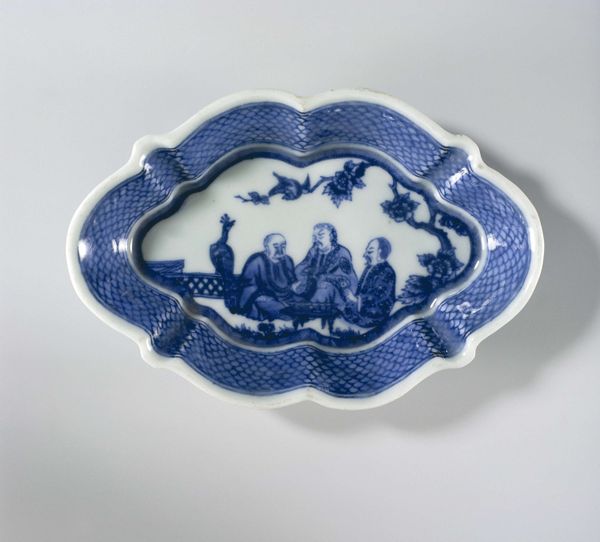 Editor: This lovely earthenware dish, created between 1695 and 1720 in the style of De Paauw, immediately strikes me with its vibrant blue glaze contrasted against the delicate white floral patterns. The baroque ornamentation feels almost playful. What formal elements do you find most compelling? Curator: The dichotomy between the cobalt blue ground and the white tin-glaze decoration is quite arresting. Notice how the floral arrangement in the center, with its stylized botanicals, adheres to a strict sense of balance and symmetry. Do you see how the negative space around the central motif is as important as the painted elements themselves? Editor: Yes, the strategic use of negative space accentuates the delicate curves of each flower and helps to maintain clarity, preventing the overall design from feeling cluttered. The scalloped edge is particularly elegant, too. Curator: Indeed. And observe the consistent line quality throughout the floral motifs. There’s a remarkable control evident in the brushstrokes, creating a unified and cohesive visual language across the entire surface. The composition isn’t merely decorative, but formally rigorous. How does the materiality itself inform your reading? Editor: It’s interesting you bring up the material. I wonder how the texture of the ceramic, smooth yet imperfect, plays into this conversation of rigorous execution versus an almost 'organic' feel suggested by the floral design? It seems the tension between those aspects creates something lovely and refined. Curator: Precisely. By isolating the visual and material qualities, we can engage with its formal construction as a significant cultural artifact. Editor: I hadn't considered the interplay of these specific details before, focusing more on subject matter. Curator: By attending closely to these integral aspects of art, new appreciation and visual literacy are achievable!