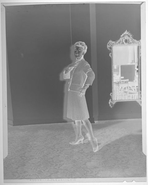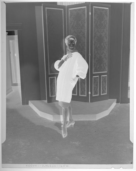Editor: This is an untitled fashion photograph by Martin Schweig, currently housed at the Harvard Art Museums. It depicts a woman removing her coat, and I find the composition quite striking, almost theatrical. What do you see in this piece? Curator: It's fascinating how this image plays with the performative aspect of fashion and portraiture. The woman's gesture, combined with the stylized backdrop, suggests a constructed reality, a carefully curated image for public consumption. How does the photographic medium contribute to this sense of artifice, do you think? Editor: Perhaps it's the way photography can both capture and create a moment, blurring the line between reality and representation. Curator: Precisely. And that tension is key to understanding the power dynamics inherent in image-making and how fashion photography, in particular, shapes our perceptions of identity and beauty. Editor: That makes me think about how much societal expectations influence both the creation and reception of such images. Thanks for sharing! Curator: My pleasure. It's always rewarding to consider how art reflects and shapes our world.