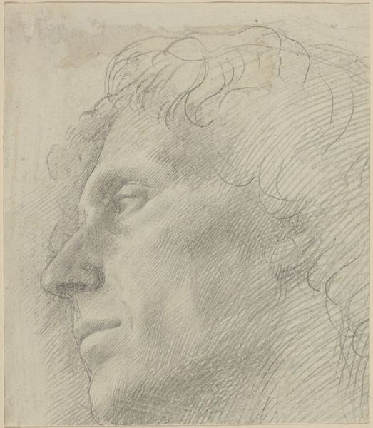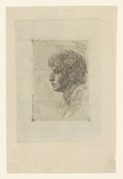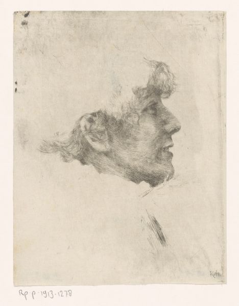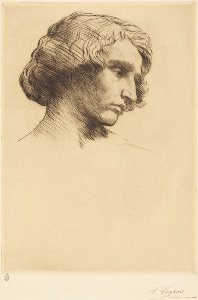 Editor: We are looking at Alphonse Legros's "Head of a Man", created sometime between 1847 and 1911. It's a striking portrait, rendered in what looks like pencil. What's most captivating to me is how the light and shadow play across the subject's face, lending a real sense of depth and maybe even a hint of melancholy. What do you see in this work, from your perspective? Curator: Formally speaking, the interplay of line and tone is quite compelling. Notice the economy of means – how Legros achieves such volume and character with relatively few, but carefully placed, marks. The hatching and cross-hatching techniques contribute significantly to the illusion of form. We can consider the directionality of the lines – how they sculpt the face, drawing our eye to particular points of emphasis, like the brow and the cheekbones. Have you noticed that? Editor: I have. It's almost as if the lines themselves are modeling the face. The directional strokes, particularly around the nose and eyes, really define his features. It’s more than just contouring, isn’t it? It is almost like sculpting on paper. Curator: Precisely. It moves beyond mere representation and hints towards the construction of the form. The varying densities create contrasts that speak to a concern with surface texture, and by extension the essence of the subject's being. Think of it as less of a literal likeness and more of a visual distillation of human form, achieved through purely formal means. It emphasizes construction rather than duplication. Editor: This way of observing the image really encourages you to dive into all the elements that build the artwork. I will try to implement this visual system more often. Thanks! Curator: Indeed, a focus on these elements is critical for unlocking layers of visual complexity.