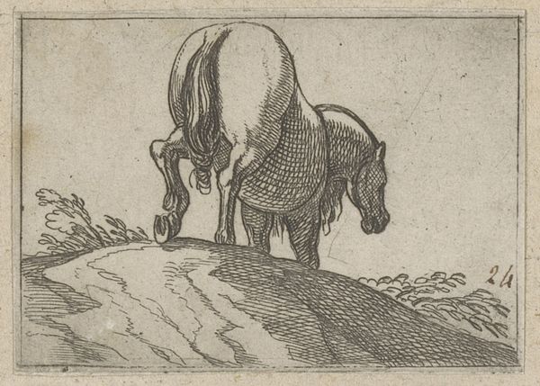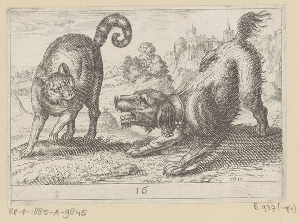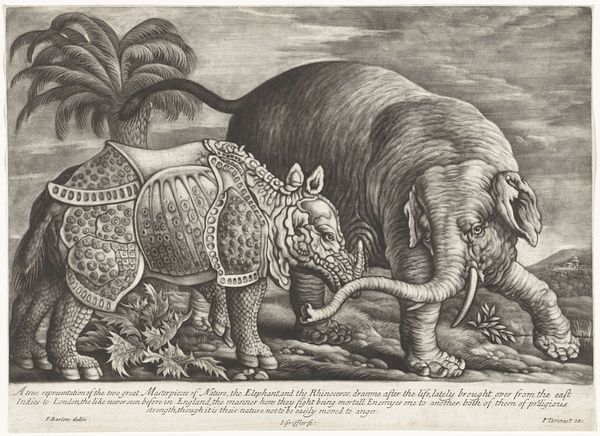 Curator: This engaging engraving from 1610 depicts “A Rhinoceros Fighting an Elephant.” It resides here with us at the Rijksmuseum, and is from the hand of an anonymous artist. I find myself drawn into the narrative it presents, a true battle of titans in the animal kingdom! What captures your attention right away? Editor: Well, initially, I'm struck by how dramatically staged it is, almost theatrical. The interplay between light and shadow emphasizes the textures and musculature, wouldn’t you agree? The landscape, seemingly exotic, serves merely as a backdrop to this violent encounter. There is so much focus placed solely on these two grappling beings! Curator: Oh, absolutely. The theatricality is potent. And I can’t help but consider how these images of dueling exotic animals must have fired the imaginations of viewers back then! The print serves as a lens through which they could witness such an imagined faraway spectacle—with maybe a little political symbolism mixed in? Editor: Interesting! From a formalist view, the engraving exhibits clear baroque characteristics. Note how the artist meticulously renders every fold of skin, the musculature straining under pressure. The composition guides your eyes relentlessly to the point of greatest tension—the area where tusks meet horn. Curator: Right! But to look beyond that visual battle, what also moves me is that potential metaphorical interpretation. The power dynamics are at play here – a smaller creature challenging something much larger. There is definitely drama but maybe a touch of hope also for the underdog. It whispers that anything can challenge the seemingly unbeatable foe! Editor: Perhaps so. But consider, too, how the print objectifies and dehumanizes conflict. By presenting it through exotic animals in an unreal landscape, the very real brutal history of domination becomes distant and unreal. So, whilst it may well be a call to fight powers, the animals presented simply provide a vehicle with which the challenge can begin. Curator: That's an insightful perspective. The composition invites us to ponder more than just the immediate visual impact, no? Ultimately it’s up to the individual to reflect on what those beasts represent, both today and historically! Editor: Exactly! Each observer must contend with their own reflections as they ponder form and its implications. Thank you for sparking that moment of artistic consideration, Curator. Curator: The pleasure has truly been all mine, Editor.