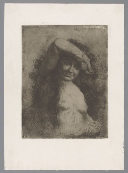 Editor: Here we have Odilon Redon’s "Perversité" from 1891, an etching showing a bust emerging from darkness. It feels quite melancholic to me; the figure's downcast gaze adds to that sense. How do you interpret the social and cultural meaning behind such a piece? Curator: Well, the title itself, "Perversité," hints at the social anxieties swirling around at the fin de siècle. Redon was working in a time of immense societal upheaval and anxieties, and his works often explore themes of the subconscious and the darker aspects of human nature. Does the darkness surrounding the bust remind you of any societal phenomena? Editor: Possibly the growing uncertainty and challenges to traditional values that were occurring back then? Curator: Exactly. Redon's art, like much Symbolist work, sought to express those internal states rather than depicting the external world. The deliberate use of shadow and the androgynous nature of the figure serve to unsettle the viewer, challenging conventional notions of beauty and morality which were largely controlled and propagated by institutions of the time. What do you think the choice of monochrome etching adds to the work's message? Editor: It amplifies that sense of unease. Color might soften the blow, but the stark blacks and whites feel quite blunt and almost confrontational. Curator: Indeed. Printmaking democratized art, allowing for wider dissemination of images that challenged established social norms, therefore causing more debate. Redon’s pieces entered the cultural conversation, provoking debate in journals and cafes and pushing the boundaries of acceptable imagery. Editor: It's fascinating how Redon uses darkness to expose not just inner turmoil, but wider societal anxieties through distribution. Thanks! Curator: And for me, it is helpful to be reminded of the emotional connection we have to such imagery that makes these older pieces timeless in sentiment.