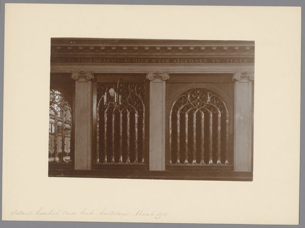 Editor: This gelatin silver print by Carl Heinrich Jacobi, titled "Part of the Exterior of San Marco in Venice," captured before 1884, really emphasizes the architectural details. It's incredible how the artist focuses on the repetitive geometric shapes. What strikes you most about its composition? Curator: I am drawn to the meticulous articulation of form and texture within Jacobi’s photograph. Note the tripartite window. It creates a compelling visual rhythm through the repetition of rounded arches and decorative circles, counterpointed by the rigidity of the bars in the window openings. Editor: The balance is definitely something I noticed. How do the circular ornaments and the rectangular grilles affect the image as a whole? Curator: The ornaments soften the geometric rigidity. Do you see how Jacobi juxtaposes these elements? He plays with light and shadow, giving depth and dimension to the stone facade, highlighting the structure and materiality. Observe how light catches the cylindrical columns flanking each window, contrasting against the gridded shadows cast onto the facade, revealing intricate details within each window. It's a very controlled application, almost mathematically so. Editor: It’s a stunning image to look at! Considering it’s a photograph, did the lack of colour influence its aesthetic? Curator: The lack of colour encourages the viewer to engage more closely with the formal elements - the textures, shapes and composition. The limited palette allows a focused exploration of form, devoid of the distractions of chromatic nuance. The interplay of light and shadow enhances these effects. It invites contemplation on the structure's intrinsic qualities, stripped of the sensationalism that colour could impart. Do you agree? Editor: That’s a great way to put it. I initially just saw a photograph of a building, but now I recognize all these intricate details the architecture has. Curator: Precisely! We've looked beyond representation and toward the artistic treatment of the medium and structure, discovering something new.