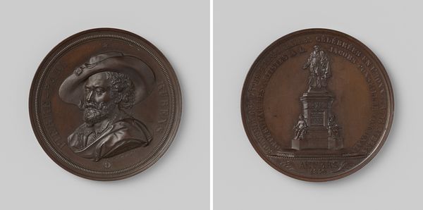 Curator: This medal, created by Thomas Halliday in 1816, commemorates the marriage of Leopold, Prince of Saxe-Coburg, and Charlotte Augusta, Princess of England. Editor: It's strikingly austere for a commemorative piece, wouldn't you say? The profiles are crisp, clean lines dominating the visual field, lending an almost solemn mood. Curator: Indeed. The neoclassical style here leans heavily on the visual language of power and dynastic succession. Halliday chose bronze for its enduring quality, a fitting material for immortalizing a royal union meant to produce heirs and secure political alliances. Editor: Bronze also provides a wonderful matte surface that enhances the bas-relief, accentuating the subtleties of the figures, especially their bone structure and carefully sculpted hairstyles. Curator: Turning to the reverse, we see an allegorical representation of felicity. Understanding this marriage requires us to situate it within the intricate web of European politics after the Napoleonic Wars. Charlotte, as heir presumptive to the British throne, represented stability, while Leopold offered connections to other European houses. The pressure on this union to produce a direct heir was enormous, shaping their public image. Editor: But the composition is rather curious. This allegorical figure is strangely devoid of energy, which contrasts rather starkly with its function. Perhaps it's the limited depth of the relief; the wings feel constrained. Curator: This medal encapsulates a critical moment where personal desires were subjected to intense scrutiny of power, privilege and patriarchal expectations of royal duty, especially reproduction, which the medal seeks to commemorate. Editor: Still, Halliday's execution exemplifies Neoclassical ideals of restraint and clarity, even if tinged with that solemnity we spoke of earlier. It is, at its core, an object carefully wrought for a specific purpose: legitimizing a political union through art. Curator: Looking at it with today's lenses of gender politics, this piece is interesting in that it reveals those deep-seated hopes and expectations embedded in the very structure of 19th century royalty. Editor: A fascinating demonstration of form serving function, even down to the selection of materials. Thank you, a superb artwork for discussion.