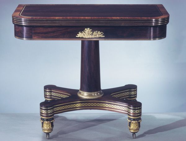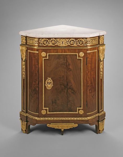 Curator: Immediately, I see power and restraint. This is no ordinary table. Editor: Exactly! What grabs me is the collision of materials – the cool, smooth marble against the dark, richly-grained wood. The juxtaposition screams luxury. This is a table flaunting its wealth. Curator: Precisely! What you're sensing speaks to the essence of Neoclassicism. This piece, a console table crafted around 1810 by E. Muller, is an excellent example. Note the deliberate adoption of classical forms. Editor: The production itself is really interesting. Think about the workshops needed to source, cut, and carve these materials. The labour! This isn't just design, it's an entire system of making and consumption right there. Curator: The winged caryatids with feline feet certainly emphasize a potent protective symbolism! They guard secrets. Notice the details on those figures and along the top section with stylized anthems that echo ancient Greek motifs, repeated as if a memory! Editor: Repetition signifying wealth, power and a sense of classicism, right? You know, what intrigues me about the winged caryatids – how they connect function and display. The way material itself conveys a narrative around this particular table. Curator: Indeed. The visual program merges classical and perhaps a hint of Egyptian revival elements which were gaining prominence at the time as signifiers of enduring power. The choice of potent symbols speaks to this aspiration of permanence. Editor: I think the table says as much about aspiration as actual social standing, even just purely decorative. It tells a story, that production of status and power relies not on raw functionality or aesthetic vision, but really its distribution, on how that meaning then gets consumed! Curator: Fascinating, the image presents a strong architectural presence on par with ancient monuments intended for similar symbolic meaning-making! This reinforces my initial instinct of this piece expressing cultural weight. Editor: Well, next time I see a marble table top, I know I'll certainly be wondering who processed the raw material! Curator: I shall think about its classical imagery – and how people find continuity and meaning throughout historical styles.