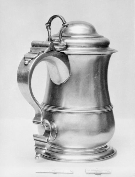 Curator: Here we have an intriguing example of early 18th-century craftsmanship: a silver tankard dating from 1715 to 1716, currently housed at the Metropolitan Museum of Art. Editor: It strikes me as incredibly austere, almost devoid of ornamentation, save for that slightly overwrought thumbpiece. Does it read as puritanical to you, or am I projecting? Curator: It's more than likely reflecting the social context of its creation, actually. At that time, English silver was impacted by stricter regulatory controls regarding the fineness of silver and standardization; perhaps simplicity was demanded for practical production reasons as well as dictated by tastes. Editor: Even so, one can’t deny the subtle visual pleasures inherent in its composition: the way the light catches the gently curved surface of the barrel, offset by the crisp horizontals of its base and lid... There is a quiet elegance in that restraint. Curator: And consider the broader impact of such objects! These weren't just drinking vessels, they signified status and wealth. Craftsmanship becomes intertwined with socio-economic history here—who made it, for whom, and what statement did it make about its owner’s position in society? The marks would probably tell a very specific story. Editor: Yes, I agree on the social context, but for me the inherent structure offers something deeply pleasing, regardless of its social implications. The semiotic language of cylindrical form—the connotations of containment, of the domestic sphere… the dialogue between mass and line. It is very balanced! Curator: Right. So, looking beyond its obvious function, we glimpse a story about labor, about trade, and about a developing sense of bourgeois display. And while, as you suggest, there's beauty to be found in its geometry and form, for me that all comes back to material conditions from which it was produced. Editor: An object lesson, in more ways than one, it seems. I can appreciate the ways that examining production will change your perception of what a decorative artwork might be. Curator: Likewise! Understanding the ways the composition and inherent nature impact the viewer will cause one to explore its story with more gusto!
