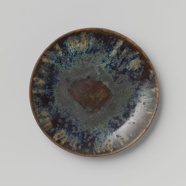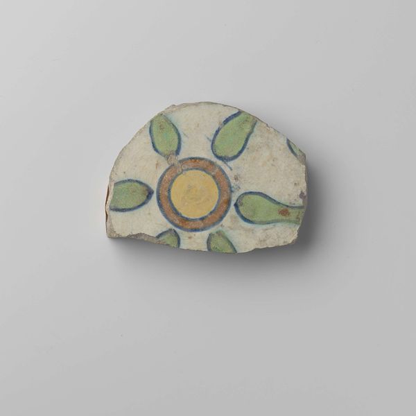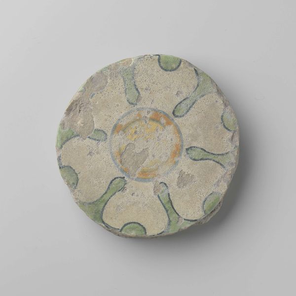 This tile, of unknown date, originates from the castle of Breda and was crafted by an anonymous artisan. Its circular form immediately draws the eye, with a pale, neutral ground that serves as a canvas for a simple yet evocative design. At the tile’s center, we see concentric circles of yellow, orange, and blue, reminiscent of a stylized sun. Radiating outwards are teardrop shapes of green, which could suggest leaves or petals. The composition cleverly balances symmetry with slight variations in the shapes and spacing of the surrounding green motifs. The rough texture and imperfect edges of the tile’s surface introduce an element of the vernacular. The tile exists as both a functional object and a decorative element. Its circular design can be seen as an early form of radial symmetry, a formal device found across cultures to convey balance and harmony. The symbolic interplay of the 'sun' and 'leaf' motifs creates a visual discourse that invites ongoing interpretation.
