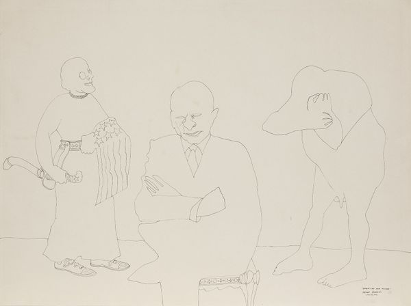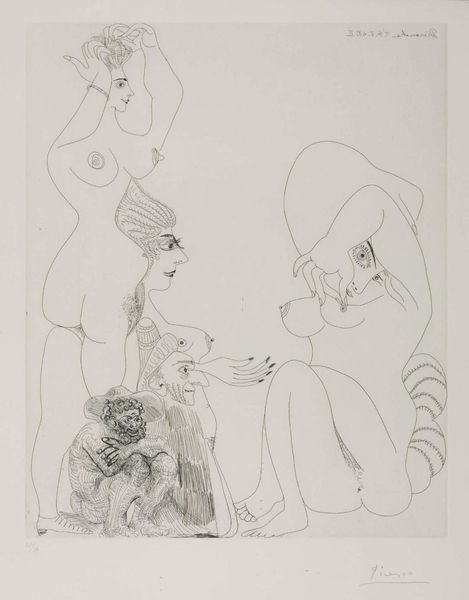 The bullfight was a subject Picasso returned to frequently, particularly after the mid-1950s. In this print, the banderillero, whose task is to wound the bull by driving darts into its neck or shoulders, is transformed into a young woman. Her prey is an older man carrying a bull's head mask who kneels in front of her, as if in submission. The fight between man and bull becomes an ironic metaphor for the battle of the sexes at a time when Picasso was becoming particularly aware of his own ageing. Gallery label, August 2004