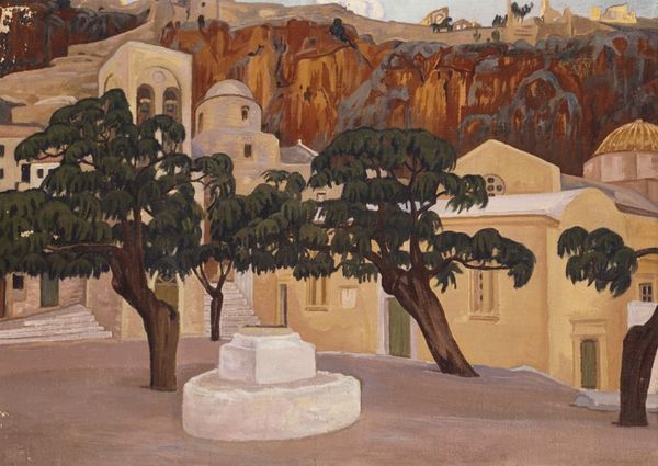 Curator: This is Konstantinos Maleas’s, "The Church of the Pantanassa, Naxos", rendered in oil on canvas in 1928. Editor: Striking! There's a certain starkness, almost like a stage set. The whitewashed building against the cool sky—it feels incredibly modern for something painted almost a century ago. Curator: Indeed, its simplified forms reveal a strong Modernist sensibility. The interplay of geometric volumes, particularly the dome and cubic structures, presents a visual dialogue between pure form and representational space. Note the strategic impasto in areas catching light, a key feature to explore its texture and tonality. Editor: You’re right, those deliberate textures are interesting, and contribute to its formal strength. Beyond that though, I see how the bright, reflective surfaces underscore a socio-political reading: Naxos, like many Greek islands, embodies a unique cultural resilience, adapting and surviving through countless occupations and shifts in power. The bright, almost defiant whiteness of these buildings, is really an expression of persistence against all odds. Curator: An intriguing perspective. But structurally, observe how Maleas uses the tree, centrally positioned, to mediate the severe lines of the architecture. It introduces a dynamic asymmetry, disrupting an otherwise rigid composition. Editor: Fair enough. And yet, in that contrast—the rigid versus the organic, you know, one could also read it as a symbol for how tradition can live alongside, or even in conflict with, the natural world. Churches and olive trees—these endure. Also, did Maleas maybe choose this spot on Naxos very deliberately as a sort of symbol? Was there any political statement about religion intended at the time it was made? Curator: Unfortunately, accessing definitive political or ideological claims within his artistic choices is challenging; nonetheless, the way he organizes the plastic elements makes for a complex, if formally compelling work. Editor: So, even without explicit messaging, Maleas captured something enduring about place, memory and possibly faith. These whitewashed structures stand, resilient like those who built and still inhabit them. Curator: I concur. It is the power of arrangement, after all, that elevates this vista beyond a mere representation. The experience itself, distilled through a carefully orchestrated formal schema.