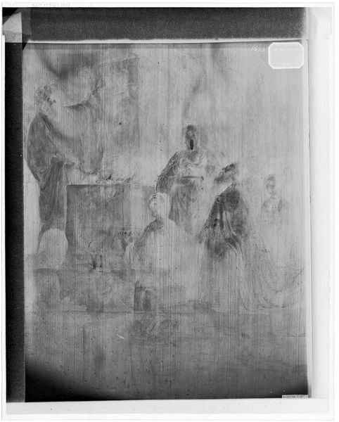 Editor: This is an X-radiograph of "St. Zenobius" by Benozzo Gozzoli. It's fascinating to see the layers beneath the surface. What secrets does this ghostly image reveal to you? Curator: It's like peering into the soul of the artwork, isn't it? We see how Gozzoli built up the composition, perhaps revealing earlier ideas he then painted over. It whispers about process, about the artist's hand at work, improvising. Editor: So, it's not just about seeing what's there, but imagining what *was* there, too? Curator: Exactly! It’s a glimpse into the art making, an archeological dig into creativity itself. Makes you wonder what masterpieces are hiding beneath other masterpieces, doesn't it? Editor: Absolutely! I'll never look at a painting the same way again.