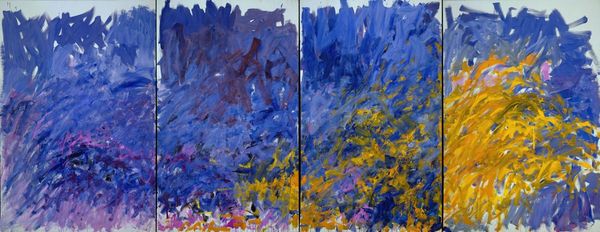 Joan Mitchell, a vital force in the male-dominated world of Abstract Expressionism, created "Riviere" as one of many paintings that expressed her emotional landscape. While the male Abstract Expressionists were busy mythologizing themselves, Mitchell was getting on with the business of painting. She has said, “I paint from remembered landscapes that I carry with me – and remembered feelings of them, which of course become transformed.” The energetic brushstrokes and vibrant colors in “Riviere” aren’t trying to just represent the landscape, but instead transmit the feeling of being in it. The diptych structure of “Riviere” evokes a sense of expanse, pulling us into Mitchell’s immersive world. Consider how Mitchell uses color and form to convey her personal experience of the world, transforming observations into deeply felt abstractions. It is through this intensely personal expression that her work transcends the limits of traditional landscape painting and becomes a powerful statement of self.
