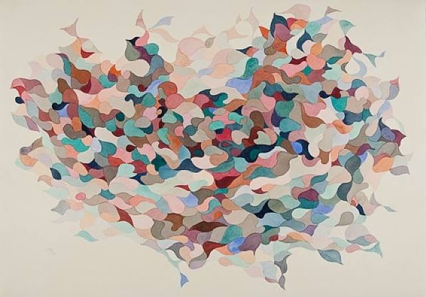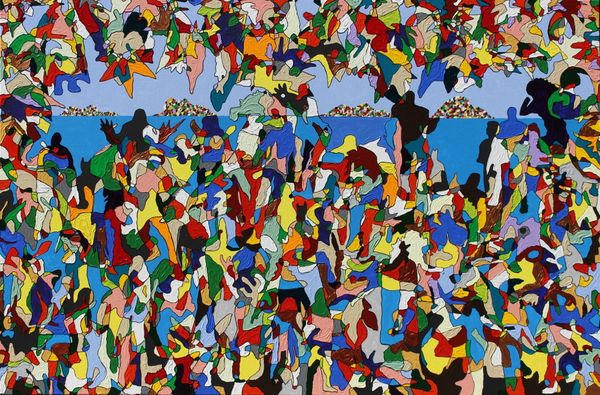 Albrecht Behmel created this painting, "Circling Sharks," using acrylic on canvas. Acrylic paint is interesting: it came into widespread use in the mid-20th century and has become a standard material. The sharks are arranged to create a visual push and pull. The painting has an overall sense of flatness, yet the sharks have been painted with such detail, almost like a mosaic of color. The many sharks give the impression of movement. The labor involved in painting such tiny details is a sign of the artist’s intense focus and commitment. The use of acrylic here reflects broader social issues of labor, politics, and consumption, and the amount of work involved in its production. This all reminds us that understanding art involves recognizing the artist’s labor, material choices, and how it all relates to culture.