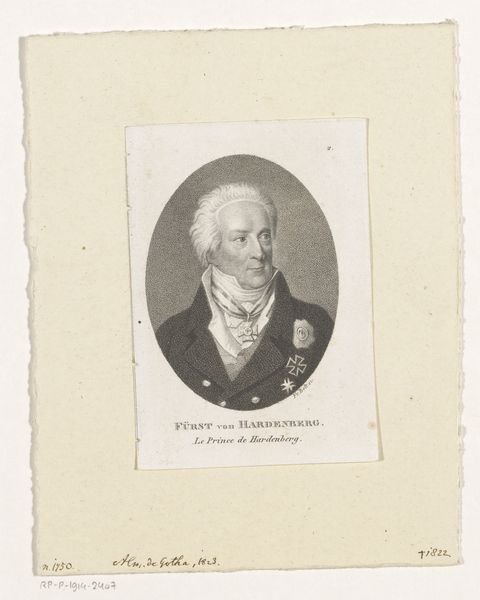 Curator: This is a print titled "Portret van Frans II" or "Portrait of Francis II," dating from the period of 1778 to 1835, attributed to Franz Valentin Durmer. It’s an engraving. Editor: The coolness of tone in this portrait is striking. It presents an air of very measured, perhaps even repressed, authority. The grey tones enhance the sense of distance, doesn't it? Curator: Absolutely. As a Neoclassical piece, it adheres to conventions. Notice the oval frame containing the subject, a common feature suggesting both containment and classical allusion. The trappings of state, like his medals and coat of arms, assert the sitter's rank, but don't you feel it lacks the grandeur of some earlier royal portraiture? Editor: Perhaps, but there’s something inherently interesting about this particular rendition of power. The way Francis holds his hand, seemingly offering something, yet maintaining a tangible distance. It’s not overtly majestic, reflecting broader shifts in the understanding of leadership during the late 18th and early 19th centuries as society edged into modernity. What symbolic meaning did the artist instill? Curator: Symbolically, of course, we have the Hapsburg double-headed eagle, representing the Emperor’s dominion over multiple realms, visually unifying his titles: Emperor, King of Bohemia, Austria, and more. The restrained expression would surely be calculated— projecting both strength and reason in an age defined by Enlightenment ideals clashing with inherited authority. Editor: It's also worthwhile considering what was happening at the time in history and politics and to interpret those choices. As revolution swept Europe, the depiction of rulers started reflecting a new imperative: to appear rational, in control, yet aware of their place in the rapidly changing political climate. How would the public view these images at the time? Curator: That's a shrewd point. The circulation of prints like this allowed for wider dissemination of the emperor's image, helping to shape public opinion, an early form of image control if you like. Academic art served definite social and political purposes. Editor: It’s really captivating how much these carefully crafted images can tell us not just about the sitter, but about the evolving politics of visual representation and power. Curator: Indeed. It's a poignant reminder that even the most formalized portraits reveal a complex web of artistic intention, political context, and the shifting sands of cultural perception.