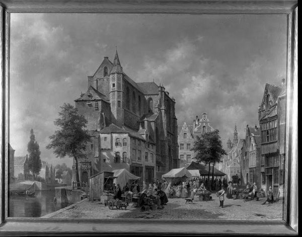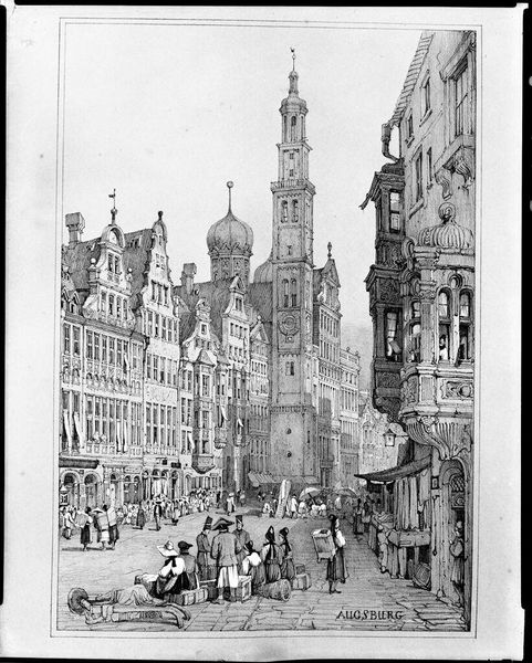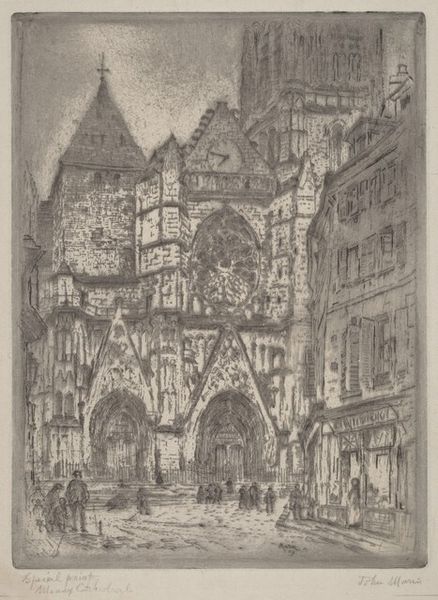 Curator: This is Samuel Prout’s "Saint Andrews, Brunswick," held here at the Harvard Art Museums. The work captures the grandeur of the church juxtaposed with the everyday life of the town. Editor: It feels incredibly detailed yet also very dreamlike, almost like a memory being reconstructed. The monochrome palette gives it a timeless quality. Curator: Prout was known for his architectural renderings. The print illustrates the church as not just a religious structure but a visual anchor within its urban context. Editor: The people in the foreground humanize the impressive architecture, don't they? Their presence suggests a continuous history of labor and living. The drawing brings to mind the social fabric woven around landmarks such as this. Curator: Exactly. The careful rendering of light and shadow emphasizes the church’s solidity and permanence. Notice how Prout's skilled use of perspective guides our eye. Editor: It's a powerful reminder of the layers of history embedded in a single place. You can almost feel the weight of tradition, and the community that holds it all. Curator: A poignant perspective that leaves much to consider about place and belonging. Editor: Indeed, a quiet but impactful reflection on the intersection of faith, community, and the spaces they inhabit.