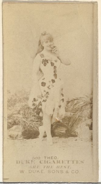Editor: Here we have “Card Number 514, Miss Clement” from the Actors and Actresses series made by W. Duke, Sons & Co. in the 1880s. It's a print. There's something intriguing about the pose; it feels both staged and somehow a bit vulnerable. What stands out to you, looking at this image? Curator: Primarily, I note the intricate use of line and form. Consider the balance achieved within the constraints of the card format. The figure of Miss Clement, rendered in delicate pencil work, is strategically positioned to create a visually compelling composition. Note the tonal variations in the paper, skillfully used to define the figure and establish depth. How does this interplay of line and tone contribute to the overall impact, in your opinion? Editor: I see what you mean about the composition, and I see what I'd consider some lighter and darker lines to give depth. So, from a formalist point of view, the fact that it was an advertisement is not something we need to concern ourselves with? Curator: Precisely. While the card functions as advertisement, my focus remains on its intrinsic artistic qualities. Observe how the textures – the smooth expanse of her dress, contrasted with the hatched background suggestive of waves – generate visual interest. Can you see the semiotic implications embedded within these stylistic choices? How does the artist communicate depth through material and form? Editor: I think so. It gives the piece a tactile quality despite its small size and the limitations of the print medium. I guess thinking about the tension and relationship between all these artistic elements gives me a new appreciation. Curator: Indeed. By examining the visual language employed, we unlock a deeper appreciation for the artistry at play, irrespective of its commercial origins. I find my eye being pulled in by these types of artistic renderings in mass production!