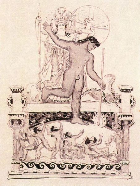 Curator: Look at the intense detail in Frantisek Kupka's drawing, "The Song of Songs," completed in 1904. The piece is an ink drawing, showcasing the artist's symbolism. Editor: It’s like a fever dream, isn't it? A dense, almost claustrophobic space teeming with figures, all rendered in stark black ink. There’s a powerful sensuality about it, but also something unsettling. Curator: Exactly. This piece blends erotic themes with broader allegorical intent. Kupka’s interests at the time centered on themes of love, longing, and perhaps, the perceived conflicts between spirituality and physicality that were circulating within artistic and intellectual circles. Editor: The gaze is interesting. The nude female figure is positioned in such a way that the composition itself centers around her sexuality, a problematic interpretation through today's social awareness. The work exists during a transitional period where many artists attempt to subvert traditional portrayals but ultimately, fall short. It brings forth important discussions about consent, sexuality, and artistic representation. Curator: Indeed. Her placement and the surrounding symbolism—the snakes, the sculptures— speak to the complex and often contradictory ways that women's bodies were represented at the turn of the century. Also, notice the Stars of David—another clue pointing to the themes that Kupka wove together. Editor: And I see not just the cultural baggage, but the artist also experiments with representing this internal and intellectual landscape, with all its contradictions and messiness, using this rich symbolic language. Kupka dared to depict the forbidden. The surrealism allows us to confront the artist's fantasy of both woman and eroticism. Curator: I agree, and through this provocative, allegorical style, Kupka challenges the conservative artistic climate and social constraints through the very language of visual culture. Editor: Right, considering his later ventures into abstraction, one could interpret "The Song of Songs" as a necessary confrontation, a step towards liberating himself—and his art—from such symbolic constraints altogether. It’s quite a compelling example of art and transformation. Curator: Definitely, and that’s how understanding art history really enriches the whole experience. Editor: I agree. Being socially aware while analyzing art helps you have a deeper connection with the work.