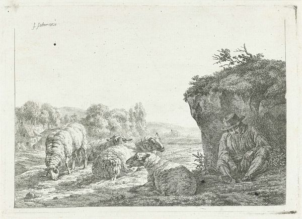 Curator: What strikes me immediately about this drawing, "Twee liggende schapen," or "Two Lying Sheep," from 1842 by Frédéric Théodore Faber, is the quietness. It’s almost like a lullaby captured on paper. Editor: It really is delicate work, isn’t it? Faber rendered these animals in pencil, using very fine lines, placing them in what appears to be a sprawling landscape. You can see he clearly understood animal anatomy, though I wonder about the intention behind presenting them in such a pastoral scene. Curator: The placement within the landscape, I think, evokes a certain societal relationship to animals, even now. They become part of the idealized rural scene, reflecting a vision of order and productivity that landowners promoted during the early to mid-19th century. Note how the sheep are not individualized; they are, dare I say, commodities nestled in the grass. Editor: Hmmm, maybe. To me, it feels more intimate. I get a sense Faber simply enjoyed observing these creatures. There's a genuine curiosity here, don't you think? The loose strokes suggest immediacy, as if sketched in situ, a stolen moment of beauty and calm. You can practically feel the wool... maybe even smell it, haha! It's so far removed from the idealized, grand landscapes favored at the time. Curator: Ah, but isn’t that part of its subtle politics? By representing "ordinary" sheep rather than dramatic, romanticized visions of nature, Faber might be quietly commenting on the economic realities of the time. Sheep were integral to the Dutch economy, after all. Presenting them so peacefully perhaps obscures the hard labor associated with sheep farming. It serves almost as propaganda to garner admiration and approval of wealth obtained by exploitation. Editor: Okay, I get the socioeconomic angle... I suppose I resist pinning down something that also sings with observation. The light is treated so sensitively here; it’s less about agriculture, and more about atmosphere. The sheep have a warmth from this memory that the landscape behind is absent. The soft pencil feels almost like an extension of their wool. You feel invited to sit and soak it up, too. Curator: Ultimately, Faber’s “Two Lying Sheep” is a deceptively simple piece that resonates in multiple ways. The piece serves as a window into art’s role in representing—and perhaps shaping—our understanding of the natural world and its relationship to economic realities. Editor: I agree! I see it also as a lesson to remember how powerfully personal observation can shape not only what we see but also what stories those images inevitably tell.
