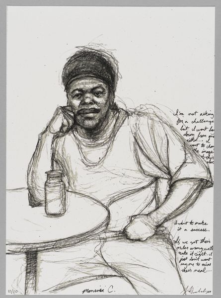 Editor: This is Sedrick Huckaby's "99% NO.44 Angela," a small drawing at the Harvard Art Museums. It looks like charcoal or graphite on paper. The texture seems very active and the figure is drawn with such loose marks. What do you see in this piece? Curator: The dynamism of the line is remarkable. Note how Huckaby uses hatching and cross-hatching to build up tonal depth, creating a sense of volume and form. The visible energy in the mark-making contributes to the subject's palpable vulnerability. Editor: So, you're drawn to the technique itself, not just the subject? Curator: Precisely. The artist’s hand is evident in every stroke, revealing the artistic process and the interplay between intention and execution. Ultimately, it is the synthesis of these formal elements that generates the artwork's affective power. Editor: That's fascinating; I'll look more closely at the lines themselves now.