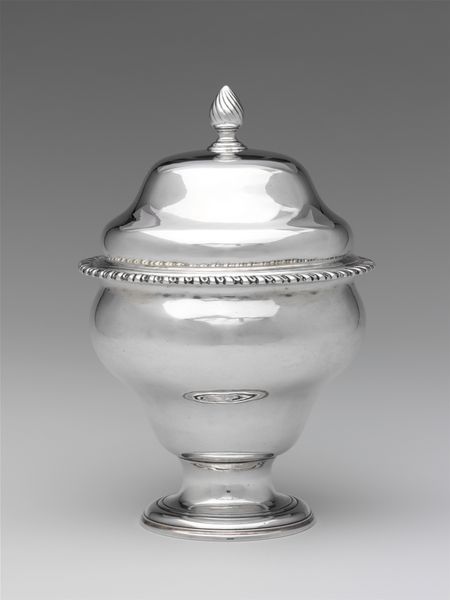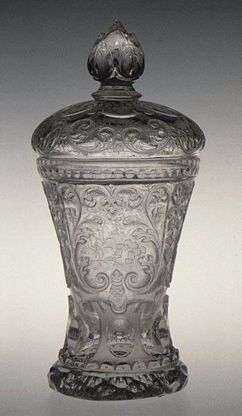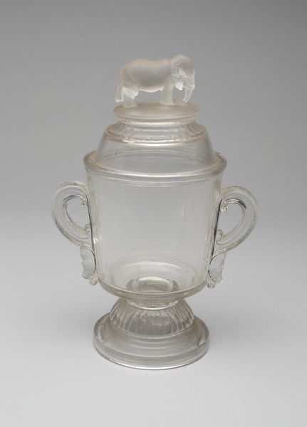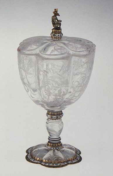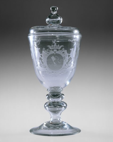 Editor: Here we have a Standing Cup with Cover, crafted between 1695 and 1705 by Franz Gundelach. It's made entirely of glass, and I find the carved details pretty captivating. What catches your eye about this ornate object? Curator: I'm immediately drawn to the production of this glass. The Baroque period was marked by a rise in specialized craftsmanship, but let's consider what it means to transform a raw material like silica through intense labor into something this elaborate. It makes one question the power structures at play. Who benefits from this level of material refinement and luxury? Editor: That's a perspective I hadn't fully considered. I was more focused on the classical scenes etched on the surface. Is there a relationship between the etched design, possibly inspired from Ancient Greece, and the rise of craftmanship and production? Curator: Precisely! We must also think about the tools, the workshops, and the specific skills needed to execute something this intricate. Glassblowing alone was a highly specialized trade. Then, someone else had to cut and engrave the figures. These weren't isolated artists working alone, were they? So who *are* these anonymous glassworkers and artisans and how might the means of production have contributed to the cultural relevance, beyond purely aesthetics? The piece becomes less about beauty and more about the web of production and consumption during its time. Editor: I see your point. By shifting our focus to the process and the labor involved, we gain a deeper appreciation, or even critique, of the historical context that birthed this glass. I'm now really thinking about the labor, class and even trade during that era! Thank you for shedding some light! Curator: Of course. And remember, objects like these can also illuminate the vast distances that exotic raw materials travelled, from the periphery to the center.