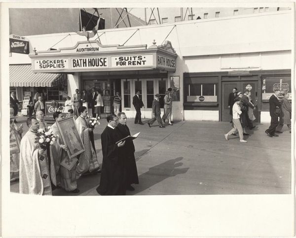 Curator: This is Robert Frank's "Greek parade--Long Beach, California," a gelatin silver print taken in 1956. What strikes you immediately about this image? Editor: There's a curious juxtaposition of the solemn with what feels subtly absurd. The somber procession is happening in front of an idealized recruitment poster of U.S. Marines singing, it creates a certain disquieting irony. Curator: Indeed. The image encapsulates some of the themes Frank was exploring at the time, particularly the contrast between established cultural narratives and the realities of postwar America. Think about how social structures influenced this period, how religious institutions operated against militarization efforts during the Cold War... Editor: The Marine poster and the figures gathered remind me of issues in gender and patriotism; specifically the performative nature of nationalism and idealized masculinity that are interwoven into both the Marine imagery and even, to an extent, the formal religiosity on display. Curator: Precisely. And Frank, with his outsider perspective as a Swiss immigrant, captured these tensions so acutely. It's fascinating to consider this moment, just a decade after the war, through his lens. How might a viewer from that time have interpreted it versus someone today? Editor: I'm also wondering what dialogues exist, for Frank himself, about being a white male outsider making an art form out of subverting cultural and patriotic forms like military groups or the Long Beach Greek community displayed here. This brings a vital layer to it, asking who can hold or offer such counterpoints? Curator: It brings us back to the enduring questions about perspective, authority, and the complex relationships between artist, subject, and audience. Editor: Ultimately, Frank's "Greek parade--Long Beach, California" prompts essential conversations around belonging, representation, and the enduring power of photography to dissect the social landscape. Curator: Agreed. And that dialogue, I believe, is what makes Frank's work consistently resonant and deeply unsettling.