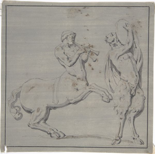 Editor: Here we have a charcoal drawing by Denijs Calvaert, created in 1574 after Raphael, titled "A Winged Putto Riding a Sea Horse and a Lion." It strikes me as quite fantastical, almost dreamlike, with the juxtaposition of these mythical creatures. How do you interpret this work, particularly its symbolism? Curator: Well, first, let's consider what a winged putto generally signifies: divine love, innocence, mediation. Now consider *what* this particular putto is riding! The lion, classically a symbol of strength, royalty, the sun. Juxtapose that with the seahorse, an emblem of the sea, fluidity, adaptability. The fusion… it seems to speak of tamed power. Does this ‘mediation’ have a darker meaning when those beasts are ridden as transport, I wonder? Editor: Tamed power, that's an interesting way to phrase it. I suppose it makes sense, linking earthly power, suggested by the Lion, to spiritual authority. What of the drawing’s connection to Raphael? Curator: Raphael's influence is clear, harking back to classical ideals of beauty and harmony, now filtered through a later Mannerist lens. It invites reflection on the continuity of cultural memory, but also on its transformation. It suggests a lineage of artistic ideas but adapted to a different context. Do you notice the adaptation of shading, almost a symbolic rendering? Editor: Yes, actually! So, it’s not just a copy but a reinterpretation with its own symbolic weight and Calvaert’s own style. I guess these figures aren’t just decorative elements, they really carry the message, changed or renewed, through time. Curator: Precisely! Visual symbols are anything but stable - their meanings ripple through time and context. A powerful idea for a work in charcoal. Editor: Absolutely, a new way of considering ‘copies’ and the agency an artist may have to transform even a ‘reproduction’ into an iconographic statement! Thanks so much.