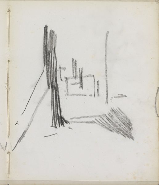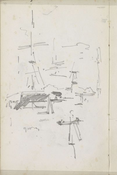 Editor: This is George Hendrik Breitner's "Studie" from somewhere around 1880 to 1882, a sketch on paper using pencil. It's... sparse, isn't it? Almost ephemeral. What's your read on a piece like this? Curator: Ah, Breitner. This, my dear friend, is a whisper of an idea. I imagine him, notebook in hand, catching glimpses – a fleeting landscape, a construction perhaps. See how the lines dance, barely tethered to reality? It's as if he's trying to capture not what he sees, but how he feels, the very sensation of observing. Makes you wonder what caught his eye, doesn't it? Editor: Definitely makes you wonder. The sketchiness makes it feel unfinished, more about process than product. Does that tie into the Impressionist label? Curator: Precisely! It's that embrace of the transient, the momentary. Impressionism isn't just about dappled sunlight; it's about capturing the spirit of a thing, even if the details are blurred. Look at how he suggests forms with so few lines, almost daring us to fill in the blanks with our own imaginations. Makes you question, what *is* complete anyway? Is anything ever *really* finished? Editor: I see what you mean! So, the sketchiness is deliberate, inviting the viewer to participate. It's like a collaborative piece in a way. Curator: Exactly! It’s an invitation, a suggestion. And it tells us something vital about the artistic process itself. A glimpse into the artist's mind, the initial spark of an idea taking form. It reminds us that even the smallest, simplest marks can hold immense power. Editor: It’s amazing to consider all that's conveyed with so little. Thanks for pointing out those layers, I never would have seen it like that! Curator: My pleasure! Art is a conversation, after all. And sometimes, the quietest voices have the most profound things to say.