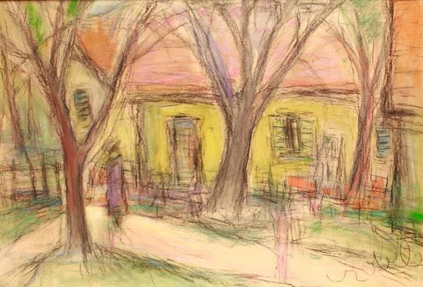 Editor: Okay, next up is "Maisema, tie, taloja"—that's "Landscape, Road, Houses" from 1910-1911 by Magnus Enckell, created with colored pencil and pastel. It strikes me as intentionally raw. I mean, you can see every stroke. It's like a memory fading in and out of focus. What jumps out at you? Curator: The piece highlights the changing artistic climate of early 20th-century Finland. Enckell, known for symbolism, here adopts a post-impressionistic approach, signaling a shift in the public perception and role of art itself. Artists started to explore more subjective and personal experiences rather than grand historical narratives, right? Editor: Definitely. The color palette is unusual. I'm drawn to that lilac sky… and how it almost seems to flatten the landscape, merging foreground and background. Curator: Right, the arbitrary use of color emphasizes the artwork as a construction. He is making a deliberate statement about representing 'reality.' Given the historical context – Finland was undergoing significant social and political change at this time – could Enckell be subtly suggesting a disruption of the old order, a landscape ripe for reinvention through the lens of individual experience? What role do museums play in shaping what art is viewed as culturally significant and, maybe, why this artwork never gained the deserved recognition? Editor: Wow, I hadn't considered that angle! It's easy to get caught up in just the aesthetic. So, the choice of something like colored pencil, not traditionally 'high art', becomes almost a political act, challenging those established hierarchies. Curator: Precisely! It is through these "minor" gestures that Enckell subverts expectations. It prompts the viewer to reassess not only the landscape presented but also their preconceived notions of art's function and societal value. It gives voice to personal expression! Editor: This gives me a fresh perspective to look at other landscapes, beyond the literal representation. Curator: Agreed. And that perspective itself will keep evolving.