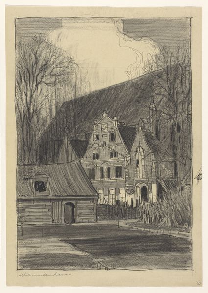 Editor: Here we have "Gezicht op het hoofdgebouw van buitenplaats Hofwijck," a 1927 ink drawing on paper by Simon Moulijn, currently residing in the Rijksmuseum. There’s something serene, almost melancholy, about it. All those precisely rendered lines make me wonder, what’s your take on this work? Curator: It whispers tales of quiet contemplation, doesn’t it? Moulijn has captured more than just the facade of Hofwijck; he's bottled a feeling. For me, this image sings a quiet song of how we attempt to contain nature, reflected in the ordered landscape and the regimented architecture, versus nature's enduring strength shown in the wild banks surrounding the building. Don’t you feel a touch of irony in it as well? Editor: Irony? I hadn't considered that! Tell me more. Curator: Look at the building, it presents an image of grandeur, of steadfastness but the reflections in the water create a fragile image. As if it would break any moment and disappear completely. It reminds us that appearances aren't everything and that all of us return to the nothingness in time. Do you pick up on that mood, or am I completely off on a tangent? Editor: No, that’s incredibly insightful! Now that you mention it, I do notice how delicate the image becomes with this new outlook. That definitely shifts my original perspective. Curator: Isn’t it fascinating how a single viewpoint can alter everything? That’s the joy of art, perpetually revealing new secrets to those who dare to look closely. Editor: Absolutely. I will definitely remember that each work contains multitudes of interpretations. Curator: Wonderful! Then our task is complete, leaving the listener something fresh to chew on, wouldn’t you agree?