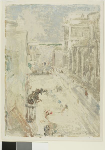 Editor: So this is Isaac Israels' "Noordeinde, the Hague" from 1918. It seems like a fairly straightforward city scene, rendered in delicate washes of color. What do you see in this painting beyond just the surface depiction of a street? Curator: I see a layered representation of Dutch society at a pivotal moment. While appearing as a simple street scene, it encapsulates the performance of class and gender in public spaces. Notice the subjects—men in suits, women in fashionable dresses. How are these individuals positioning themselves within a rapidly changing social structure just after World War I? What are they performing? Editor: I guess I was more focused on the Impressionistic technique than the social context. But, looking closer, I see what you mean. There's almost a theatrical quality to their presentation. Curator: Exactly! Israels is capturing a specific performance of modern identity in the Netherlands. The painting prompts us to consider questions about access, privilege, and representation. Who gets to occupy this space, and how? Are there people missing from this picture? Where is the working class, for example? Editor: That’s fascinating! It really does shift my perspective. It is a very 'posed' feeling, everyone seems so self-conscious about their appearance. It’s much more complex than I initially thought. Curator: Thinking about these urban spaces through a gendered lens can also be fruitful. Consider the gaze, for example. Who is looking at whom and who has agency? And what’s revealed, or concealed, by the painting's style and the artist’s choices about representation? Editor: I hadn’t considered that at all! Seeing how those layers intersect gives a completely different view. Thanks! Curator: My pleasure! Analyzing visual culture is to excavate narratives of power, identity, and resistance and you made the work more accessible and meaningful for others.
