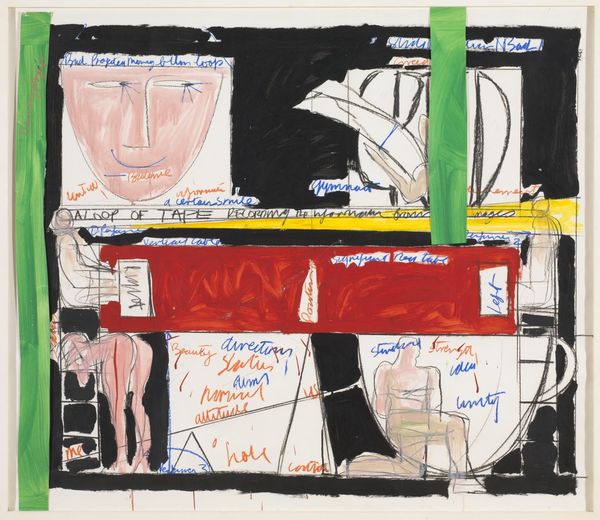 Curator: What a curious object. Is it trying to tell me a story or simply overload my senses? Editor: I get the same feeling! Let's orient ourselves. This is "Sitting... six months later," a mixed-media assemblage by Oyvind Fahlstrom, created in 1962. You can find it hanging at the Georges Pompidou Center in Paris. What draws your eye? Curator: The narrative panels, undoubtedly! I see tiny dramas unfolding, cartoonish figures interspersed with seemingly random objects—necklaces, combs, even what appears to be a miniature bus. It reminds me of decoding a cryptic dream, the logic allusive and personal. The palette itself feels like a faded memory, almost like viewing very old celluloid film stock. Editor: Yes, there's a powerful sense of personal symbolism at work here. Fahlstrom was known for his variable paintings, these game board-like constructions where the components could be rearranged to alter the narrative. While this piece appears more fixed, I sense that spirit of playful reconfiguration. Curator: It's interesting you call it "playful." I find it somewhat unsettling, maybe because the iconography feels so fragmented. The Pop Art associations are inescapable, yet there's a deeper disquiet beneath the surface. Perhaps that stems from the title— "Sitting... six months later." One senses a quiet passing of time and all its discontents. What do these symbols signify in that long interim, after everything has changed? Editor: Perhaps it captures the chaotic accumulation of experiences and objects that constitute our individual histories. Those disparate elements, juxtaposed, create new meaning and new resonances—as messy as life. There’s an acknowledgement, visually at least, that meaning changes over time in relation to everything that comes our way and sticks. Even discarded objects, presented as part of collage, have a cultural story to tell in how long they last and what form they eventually come to take on, no? Curator: It's certainly not easy art. Editor: No, but that difficulty, I think, encourages a prolonged engagement. In this artwork, Fahlstrom seems to be playing with the notion of meaning itself, offering up a visual puzzle box. Each object, each panel, hinting at something larger than we can readily grasp. It’s a conversation. I think he's asking, "What meaning are *you* bringing to this table?"