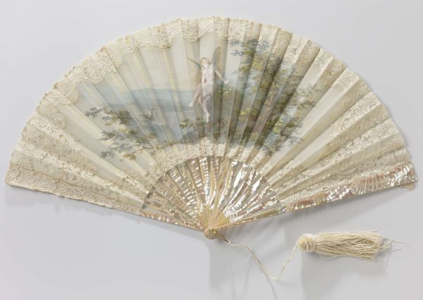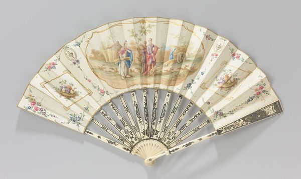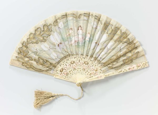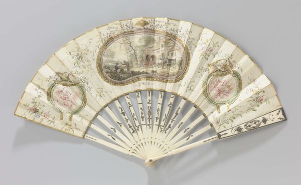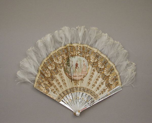 This fan was crafted by F. Leroy using silk, watercolor, ivory and gold. Fans have a history of being more than just functional items. Their delicate construction and decoration made them luxury objects, markers of status, and powerful communication tools for wealthy women. The porcelain blue floral garlands and gold trim of this particular fan are consistent with a taste for opulence. The fan’s creation involved the work of skilled artists and craftspeople. The delicate ivory frame suggests trade networks that were necessary to obtain exotic materials. By studying objects like this, historians look into the nuances of social display and the complex systems of labor and exchange that underpin elite culture.