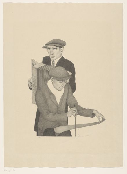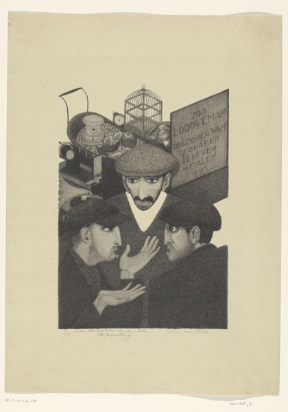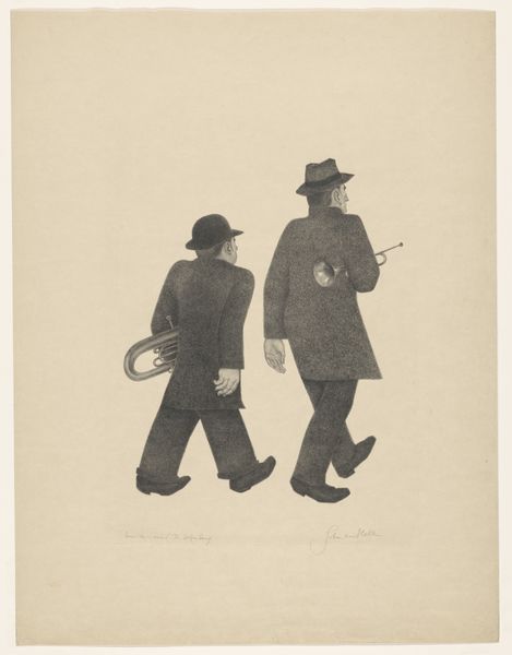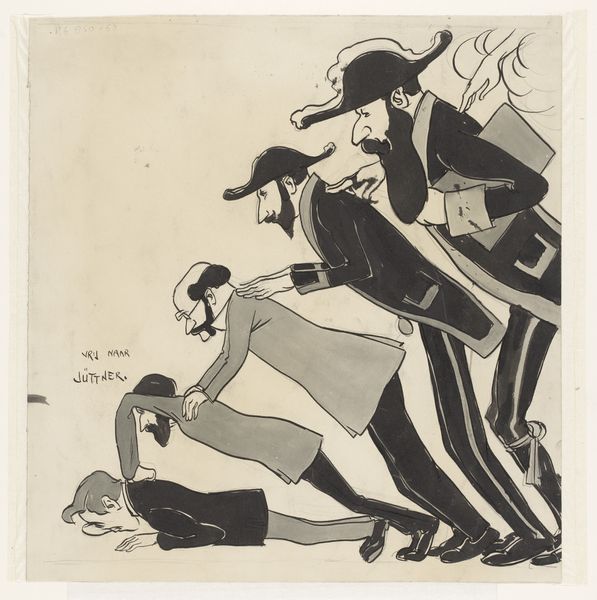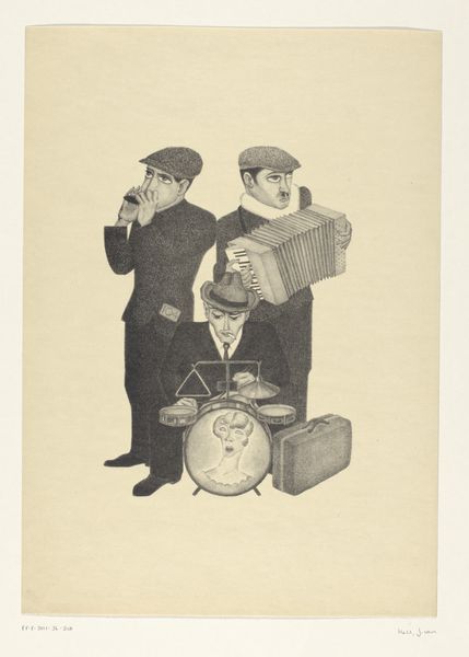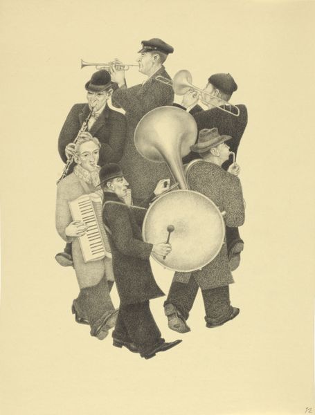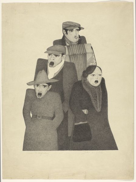 Curator: Here we have "Five Musicians" by Johan van Hell, created before 1952. It's a graphite drawing currently held in the Rijksmuseum collection. Editor: My first thought? There’s a distinct sense of weariness here, but also a stubborn refusal to give in, evident in the way the musicians clutch their instruments, each a symbol of resistance, perhaps. Curator: Indeed. Van Hell's work frequently intersected with the social and political anxieties of his time. He tragically faced persecution during the Second World War due to his sexuality and his resistance activities, which adds a significant layer to the reading of this drawing. It prompts a contemplation on the intersectional issues surrounding identity and resilience. Editor: Looking at the texture and shading, I can't help but consider the economic conditions surrounding the creation of this piece. Graphite, readily available and affordable, made art accessible even in times of scarcity. The density of marks, almost obscuring the paper itself, suggests a deliberate act of labour, highlighting the artist's means and dedication to his craft despite any hardships he faced. Curator: And within the context of resistance art, the caricature style points towards social commentary and critique, specifically toward gender performance during wartime. Who were these people during times of prosecution? How did the musicians cope with the lack of venues? Editor: Exactly. These weren’t pristine concert halls. The rough rendering underscores the immediacy and rawness of the experience—emphasizing their worn clothes and determined faces and how this performance comes across as the only venue these performers had. Curator: Their very existence and act of performing could be interpreted as resistance to normative power structures during periods of extreme social and political control, with Van Hell’s legacy as one such individual to highlight such circumstances. Editor: A moving piece of material and production under duress – where even modest methods became a conduit for social resistance. Curator: Yes, and remembering the history and context, it challenges us to reconsider our interpretation of the subjects themselves. Editor: An evocative encounter with a past struggle—the musicians standing together with resistance is a testament of creation.