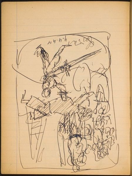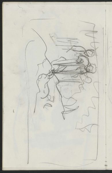 Editor: Here we have Max Beckmann’s "Mehrfigurige Kompositionsskizze (Figural Composition)," a pencil drawing from around 1920. It feels very raw and immediate. The geometric composition almost dissolves into a whirlwind of lines. What can you tell me about it? Curator: Notice how the pencil is deployed not just to represent figures, but also to define the space itself. The grid of the notebook page is important too. It anchors the frenetic energy, revealing the labor and constraints inherent in creating art, even in a preliminary sketch. Editor: So you see the materiality of the notebook itself as playing a crucial role? Curator: Absolutely! It shifts our focus from the grand narrative to the means of production. Think about the availability of paper at the time, the cost, and who would have access to such materials. This was a working drawing, made for what purpose, and by whom? How does that impact the work’s accessibility, its perceived value? The repetitive act of drawing on this simple grid elevates the process of creation. Editor: That’s interesting. I hadn’t considered the accessibility of art materials in that light. I was more focused on interpreting the figures themselves. Curator: Can you decipher forms suggesting particular gestures or relations that point towards labor itself? What does that labor signify when translated into the commodity that is art? Is Beckmann commenting on how those with power in the art world mediate such exchange? Editor: I’m starting to see how your approach allows us to examine art production as a material process deeply intertwined with economic and social realities. Thanks, that perspective makes me look at art, all art, in a different way! Curator: Indeed. Questioning these material conditions is key to understanding the artwork's significance.