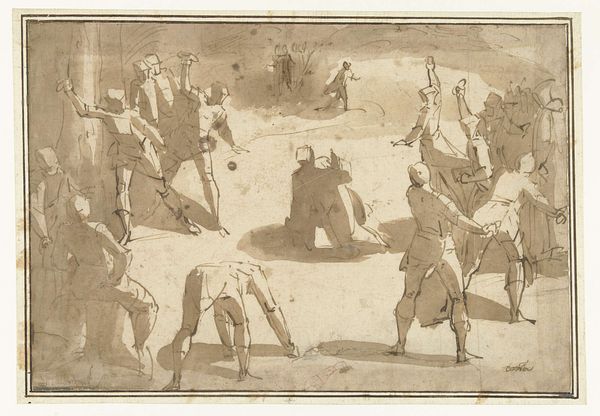 Editor: So, here we have Robert Charles Dudley's "View of the Interior of One of the Tanks on Board the Great Eastern," dating from 1865-1866. It appears to be watercolor and gouache on toned paper, currently housed at the Met. What strikes me is how it captures the almost brutal atmosphere of labor, this enclosed space filled with men pulling on ropes. What do you see in this piece? Curator: This work really highlights the often-overlooked labor and materiality inherent in grand industrial projects. Forget the romance of engineering; Dudley focuses on the social context – the men, the 'hands' that built this monumental ship. It seems the medium echoes the subject - think of the rough quality of watercolor and gouache, its inherent earthiness on toned paper to speak volumes about the grit and grime involved. Editor: That's a compelling take! So, you're saying the *way* it’s made connects directly to what it depicts? The choice of materials, almost a commentary? Curator: Precisely! The artist doesn't glorify the technological marvel of the Great Eastern. Instead, the use of humbler media acknowledges the intensive manual labor required. We see bodies working in near darkness and being part of a colossal effort. In looking closer, how do you think he used materials to portray their physical exertion? Editor: The subdued palette really emphasizes the lack of light and the overwhelming presence of the tank itself. The tonal range isn't dramatic; it feels very contained, claustrophobic almost. Curator: Exactly! And this brings us to another point – think about the production of watercolor paints and paper at the time, and how industrialization had made them more widely available. The accessibility of these materials enabled artists to document aspects of labor and industrial production more directly. Dudley’s choice wasn’t arbitrary but rooted in what was at hand, readily available and relevant to depicting labor and rapid production. Editor: I never thought about it like that, framing the materials as part of a larger system of production! So it's about bringing what's usually behind the scenes to the forefront, both in subject and material? Curator: Exactly. The image becomes less about celebrating industrial achievement, and more a document of the conditions and consumption of labor necessary to bring it to fruition. Editor: I see that now. It makes me rethink how I view the artwork; I am definitely considering the socio-economic context that has shaped the scene, which goes beyond aesthetics alone. Thank you for the different perspective!