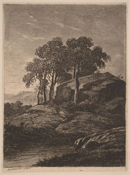 Curator: This is Daniel Turner's Landscape with Trees, a watercolor piece held in the Tate Collections. Editor: Mmm, a muted dreamscape. I find it calming, like a memory half-faded, the trees framing an unseen path. Curator: Turner was working in a period where landscape painting was gaining importance, reflecting changing social attitudes toward nature and the picturesque. Editor: I get a sense of almost a somber beauty, though. The figures down the path seem small, almost like they’re being swallowed up by the landscape. It’s quite dramatic, don't you think? Curator: The dramatic tone is interesting in terms of art production. Turner probably was attempting to imbue the landscape with a sense of sublime grandeur. Editor: It really does that. Makes you want to just wander into that scene, even though you know something unknown awaits. Gives you the sense of romantic danger. Curator: Exactly. This piece shows how landscapes were constructed and interpreted in his time. Editor: Yes, a romantic view for sure. I can imagine wanting this hanging in my house.