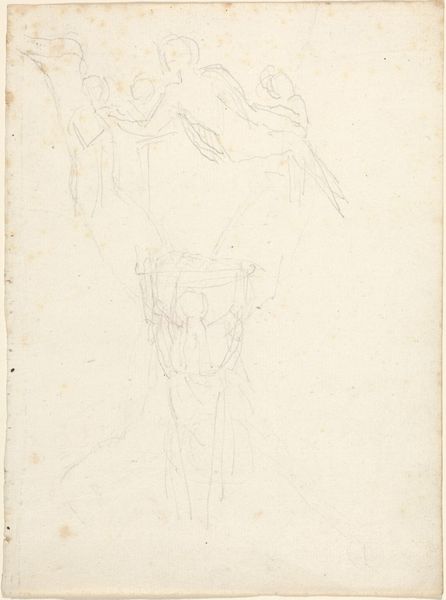 Curator: Here we have "Two Figures Embracing", a pencil drawing from the late 18th or early 19th century by John Flaxman. Editor: Immediately, it feels so tender, almost ethereally light. Like a memory sketched in pencil on a fragile piece of paper. I mean, you can almost feel the gentleness radiating from it, can’t you? Curator: Absolutely. Flaxman was a leading figure in the British Neoclassical movement. What’s striking about this work is its simplicity and the focus on pure, unadorned emotion. He distills the act of embracing to its most essential elements, stripping away any superfluous detail. Editor: It's fascinating, isn’t it? That minimalism allows so much… projection. Is it a parent and child? Lovers parting? The vagueness only heightens the sense of universal human connection. The quick, almost impatient strokes give the impression that it’s capturing a fleeing moment. Fleeting, yet eternally potent. Curator: One might consider the socio-political backdrop, too. Given the period, what narratives of family, affection, and public sentiment were being forged or contested? What impact did patriarchal values have? In doing so we begin to consider its implications, perhaps unintentionally, of Romanticism, class and sentimentality. Editor: Hmm, maybe. But I think the power of the sketch lies beyond that. Look at the tentative lines, how they almost fail to define the figures entirely! It’s a gesture towards intimacy more than a study of it. It makes me wonder about what personal narratives Flaxman embedded within. Was he thinking about anyone specific while making it, or reflecting upon larger societal patterns? Curator: A poignant consideration that links micro and macro perceptions, indeed. Editor: Looking at this piece, I feel a deep understanding of how simple gestures carry immense meaning. It suggests love or solace in a direct and unfussy way. Curator: For me, this pencil drawing reminds us that even in supposed neoclassical serenity there is always a social and affective underpinning, relevant even today.