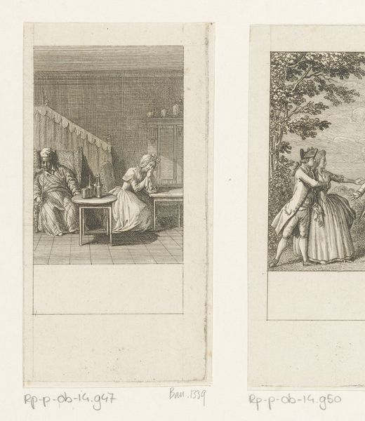 This print, "Heksenproces in Glarus," was made by Daniel Nikolaus Chodowiecki, using etching techniques. The incised lines, creating a scene of domestic life and, ominously, a woman in contemplation, speak to the printmaking process itself. Think of the labor involved in the skillful marking of the plate with fine tools. Chodowiecki would have employed acid to bite into the metal, allowing for the transfer of his design to paper. The social context is key here. The work implicates the viewer in a narrative loaded with anxiety – witch trials. The artist reminds us that what may seem like simple materials carry cultural weight. Ultimately, this print invites us to consider the potent mix of material, technique, and social commentary, which dissolves the boundaries between craft and fine art.