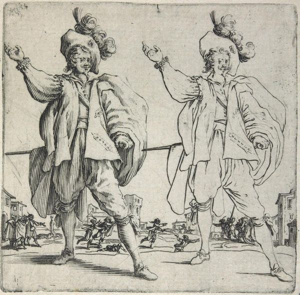 Curator: Jacques Callot's etching, "Charles Deruet and His Son," presents us with a striking composition, dating from around 1632. Note the intricate detailing achieved through the etching technique. Editor: My immediate reaction is one of formality—the stiff posture, the theatrical backdrop. There's a clear performance of status here. Curator: Absolutely. Callot was working in Lorraine, and this piece speaks volumes about the social hierarchies of the time, showcasing Deruet's self-fashioning as a man of importance. The inclusion of his son is itself a statement. Editor: The composition is rather clever too. The figures dominate, but the distant cityscape adds another layer, suggesting power and domain. It grounds the figures in a particular societal and political reality. Curator: Yes, the landscape effectively enhances Deruet's projection of authority. The delicate lines create a sense of depth and perspective that is crucial to this reading. Editor: Ultimately, Callot’s attention to detail is what truly elevates this into a glimpse into the psychology of power. Curator: A compelling point. Thank you.