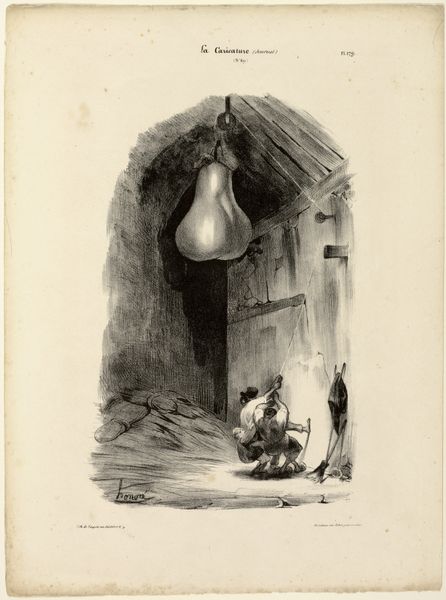 Curator: This lithograph, "Heave! Ho!... Heave! Ho! Heave! Ho!" by Honoré Daumier, depicts a group pulling a large pear down from a shadowy structure. It's quite striking, isn't it? Editor: The dark, almost oppressive atmosphere is the first thing I notice. What can you tell me about the materials and the production of such work? Curator: Daumier was a master lithographer. The print process allowed for relatively inexpensive reproduction, which made his political and social critiques accessible to a wide audience. Consider how his artistic skill highlights the labor involved in such a process. Editor: I think it's impossible to separate this image from its historical context. The pear, "la poire," was a common caricature of King Louis-Philippe. So, this scene becomes a clear, satirical commentary on the king's downfall, doesn't it? Curator: Precisely. Daumier directly linked the labor of the working class to the dismantling of power, playing on visual puns to make a powerful statement about socio-political dynamics. Editor: The visual potency of the image truly reveals art's impact on political discourse during that time. Curator: Indeed, it allows us to reflect on the role of art as a tool for social commentary and transformation.