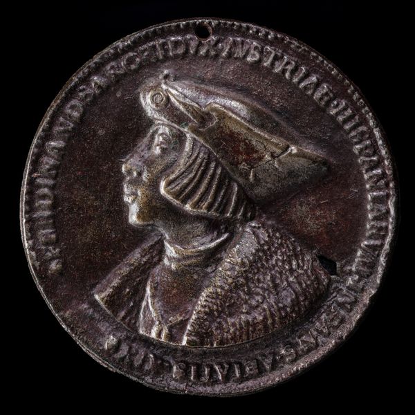 Curator: This Renaissance portrait medal, created sometime between 1500 and 1550, depicts Argentina Rangona. The artist is known as Niccolo Cavallerino, and you can find this exquisite piece here at the Met. Editor: It feels so austere, doesn’t it? Like a queen hiding behind a very practical haircut. There's something almost comical about the severity of the geometric pattern contrasting with the delicate lace around her neck. It's like a nun attending a party! Curator: The austerity is interesting when considering the historical function of these medals. They weren't merely decorative; they served to immortalize a person’s image, conveying power and status to a wider audience beyond paintings or large-scale sculptures. Editor: That's it! It's calculated. Look at the profile, how stoic and unyielding, and that monumental hairdo framing the face, creating a sense of solidity...a fortress of personality. It makes me wonder, what was she really like, underneath all that armour? Was she a softy with a penchant for romantic poetry, doomed to play a part? Curator: We do know these medals often functioned as diplomatic gifts, tools for forging political and familial alliances in the complex web of Renaissance power. Editor: So she’s not just a woman, she's a pawn on the European chessboard! And her portrait serves as her proxy, travelling afar, sealing deals with a stony, unwavering glare. The more I look, the more I think the artist captures this so vividly, the weariness around her eyes, the hint of resignation at the corner of her lips. It’s all in the subtleties, really. Curator: Precisely! Niccolo was likely conscious of producing a very specific image to be reproduced and distributed widely. The impact goes far beyond personal likeness. The act of artistic creation in Renaissance times wasn’t entirely free but always responded to demands from patrons or powerful social influences. Editor: You’ve convinced me. At first, I just saw severe geometric patterns and a stiff hairdo. Now, I detect subtle cracks, a certain vulnerability fighting its way through. The perfect art piece is more interesting for what it hides rather than for what it shows. Curator: It serves as a reminder that behind every carefully crafted public image there are real human complexities at play.