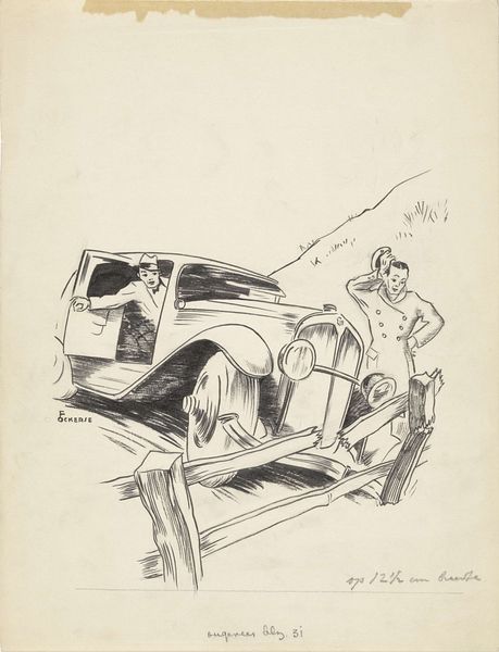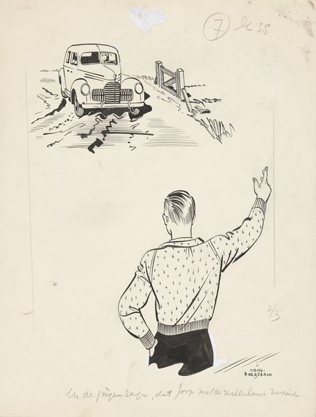F. Ockerse made this drawing, Man loopt richting een auto, with ink, and it's all about the line. Look at how the ink creates volume and shadow; there's something about how the lines give shape to the tree and the car, but especially to the man's pajamas. It's kind of funny, and unsettling. I love how the striped pajamas sort of melt into the ground, as if he’s becoming one with the earth, or maybe he’s just really tired! Then there's the guy in the car with a little bowler hat, and the one on top, tucked into the tree, it's absurd. The line isn’t fussy or precious; it is full of character. This reminds me of Saul Steinberg, who also worked with simple means to make very direct, very funny drawings that manage to be both light and dark at the same time. Art doesn't have to explain everything, you know? It’s more interesting when it leaves space for your own imagination.