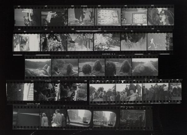 Robert Frank created this sheet of photographs, titled "Family--New York City no number." The eye is drawn to the linear structure, dictated by the film roll. Frank disrupts any conventional reading of the image through his composition. The rows present distinct, yet seemingly unrelated, scenes—a formal dinner, bleak landscapes, and portraits. This juxtaposition of images invites us to question traditional narratives of family and place. His use of stark contrasts in tonality enhances the fragmented nature of the composition. This mirrors the disjointed experience of modern life, challenging the notion of a cohesive, easily understood reality. Each frame is like a signifier, pointing to a range of possible meanings without settling on one. Ultimately, "Family--New York City no number," prompts us to consider how the structure of an artwork can destabilize established meanings, inviting a continual re-evaluation of what we see and how we interpret it.