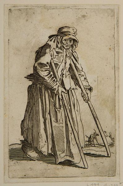 Editor: Here we have François Silvestre’s "Janissaire Porte Enseigne," a Baroque engraving from around 1650. The stark lines create a rather dramatic depiction of this standard-bearer. What elements stand out to you when you consider the formal qualities? Curator: Primarily, I am struck by the masterful use of line. Observe the way it both defines the figure and creates a sense of movement, particularly in the billowing flag and the folds of the Janissaire’s robe. The contrasting densities of line work establish value and texture; thicker lines denote depth, while finer lines suggest highlights and the intricacies of the fabrics. Do you notice any areas where this contrast is particularly effective? Editor: I see what you mean. I noticed it, too! It looks especially vibrant in the Janissaire’s turban and flowing sash – that really accentuates the subject's posture and garb, almost drawing us into their persona. Curator: Precisely. Furthermore, consider the overall composition. The figure occupies nearly the entire frame, creating a sense of imposing presence, even dominance. The arrangement of the subject with the various objects adds to the emotional context, establishing a visual hierarchy through the interplay of shapes and voids. Editor: This close visual analysis is something I hadn't initially picked up on! Curator: Considering how the work functions as a visual record of the historical and societal contexts, it also uses semiotics to portray status through garments and heraldry in a specific style. By embracing formalist considerations, our knowledge about a historical painting is far more than mere appearance. Do you find you might adjust your approach in the future? Editor: Yes, definitely. It makes me rethink how the interplay of the stylistic and construction contributes to a deeper aesthetic encounter with "Janissaire Porte Enseigne." Curator: Exactly. That visual language constructs the meaning.