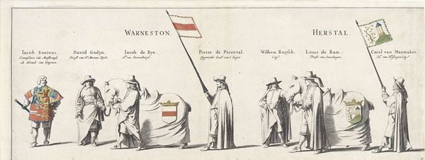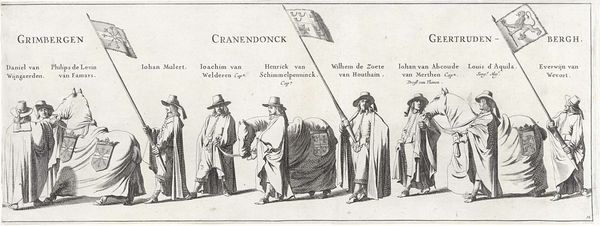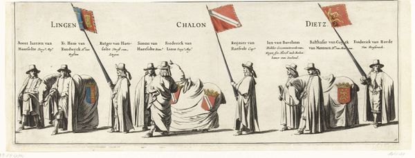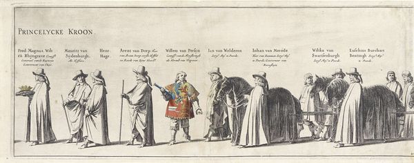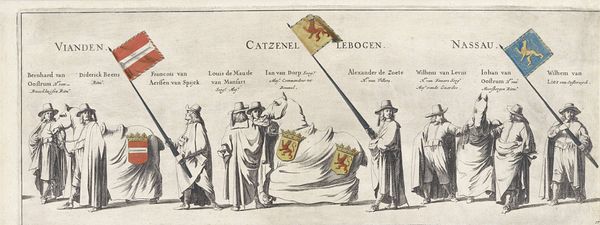 Curator: Here we have Pieter Nolpe’s print, "De begrafenisstoet van Frederik Hendrik (plaat nr. 15)", created around 1651. It's an etching and engraving, depicting the funeral procession of Frederick Henry. Editor: My immediate impression is one of somber formality, even rigidity. The composition, a frieze-like arrangement of figures, seems to underscore a profound sense of protocol and decorum. Curator: Precisely. The artist employs a linear style, typical of the Baroque period, prioritizing clarity of form. Each figure and emblem is rendered with meticulous detail. Consider the precise lines defining the fabrics, the faces, and especially the heraldic symbols. Editor: The symbols strike me as significant here. The procession isn’t just about mourning an individual, but also about affirming power structures. These aren’t simply portraits; they are political statements about lineage, authority, and territorial claims. The banners especially suggest these hierarchies. Curator: Absolutely. Note the deliberate arrangement of figures and banners, a choreography meant to emphasize status. Nolpe skillfully used line and shading to convey the texture and weight of the materials. The play of light across the composition further guides the eye, drawing attention to focal points within the arrangement. Editor: What I see beyond the impressive artistry is a representation of societal power dynamics made visible. It serves as a stark reminder of who gets remembered and how their stories are told – primarily elite, white, and male subjects, memorialized through publicly funded displays like this. Curator: Though one can critique the power structures it memorializes, it undeniably exhibits artistic ingenuity through the effective organization of its elements into a comprehensible whole. There's great value to be had examining its structural organization alone. Editor: And the impact these structures continue to have on how we relate to art. Nolpe's composition is visually powerful. Curator: It truly gives us insight into 17th-century visual culture and how such spectacles reinforced social hierarchies, no doubt. Editor: Absolutely, seeing how they influence our own.