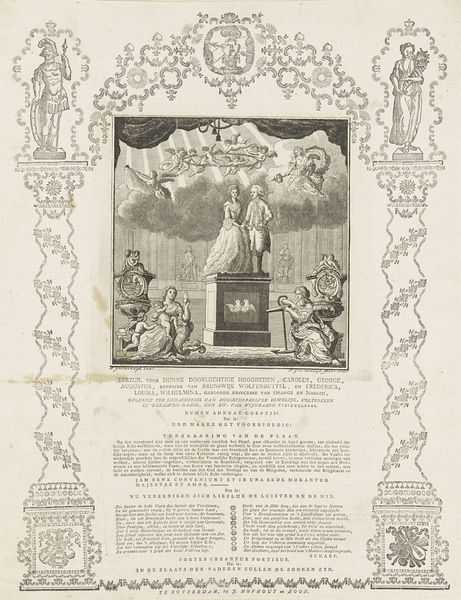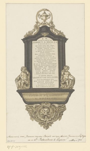 This print of a monument to Heinrich Christian von Senckenberg was created by Johann Ernst Mansfeld. The composition is structured by a formal symmetry. Putti flank either side of a plinth. Above, an oval portrait creates a focal point, framed by foliage, and reinforces this sense of classical order. Yet the figures introduce a subtle dynamism through their gestures and soft modelling. Below, a dense inscription and the monument's architectural base provide a grounding element. This contrast between the ornate details and the clean lines of the architecture embodies the period's interest in combining rationality with decorative flourish. The print's emphasis on balance and proportion conveys a sense of idealization, reflecting a broader Enlightenment concern with order and reason.
