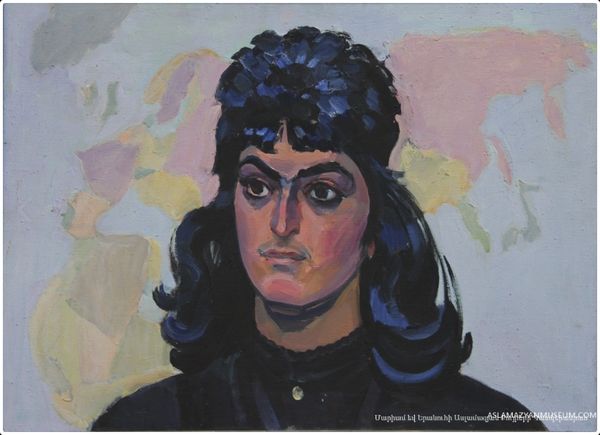 Mariam Aslamazian painted this portrait, "Gayane," using oil on canvas. The painting feels immediate; you can see the brushstrokes, the way she builds up the image layer by layer. It's like watching her think. Look at the way Aslamazian renders the background— a decorative array of blues, greens and yellows, loosely applied, letting the colours vibrate against each other. Then, your eyes are drawn to the face, rendered with this delicate pinkish hue. There's a real sense of movement and fluidity, especially in the woman's dark hair. See how the artist plays with opacity and transparency, allowing areas of the canvas to peek through while building up layers of color to create depth. It reminds me a little of Alice Neel's portraits in its directness. Aslamazian leaves space for imperfection, embracing the messiness and ambiguity that make art so interesting.