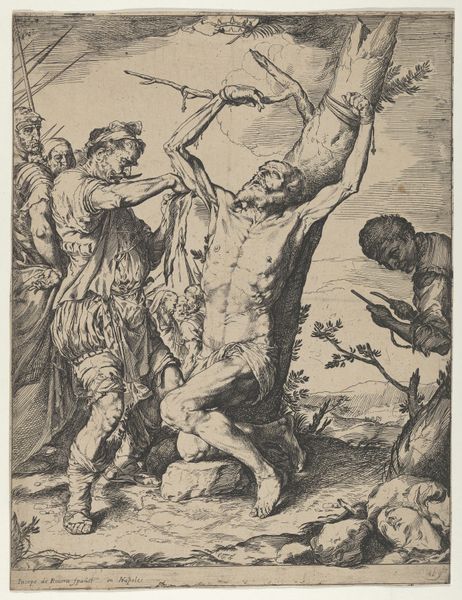 Editor: This is Marco Dente’s "God Commanding Noah to Build the Ark," created around 1520. It's a print, an engraving on paper. The overwhelming sense is one of…divine interruption. Noah, down on the ground, seemingly caught off guard, while God is floating by with angels? It all feels quite theatrical. How do you interpret this work? Curator: That’s a keen observation. Consider the context of the Italian Renaissance. Prints like this were vital for disseminating visual ideas. Dente wasn’t just creating art; he was participating in a cultural project, making imagery – biblical narrative here – accessible to a wider audience beyond those who could afford paintings. How do you think that purpose informs the visual choices here? Editor: Well, there is a clarity, right? Everything's meticulously rendered. Is that partly about communicating the story as efficiently as possible? Almost like visual rhetoric? Curator: Precisely. The composition, the idealized figures - they're not just aesthetically pleasing; they reinforce the authority of the narrative. The story of Noah, obedience to God – what societal values were these images designed to reinforce in their viewers? Think about the role of the church during this period. Editor: So it's about visually encoding those messages, using artistic skill to strengthen their impact... making them more appealing and easily 'readable' too! I guess it makes me consider who exactly the audience was supposed to be and what they already knew. Curator: Exactly! And the implications for how these stories were received and understood. Even down to the poses of Noah. Editor: I hadn't considered it like that, seeing it as a conversation between art, the artist, the commissioner if there was one, and its huge and complex audience! Thanks! Curator: And it highlights the lasting power of printmaking in shaping not just art history, but cultural values too. Something for us both to reflect on!