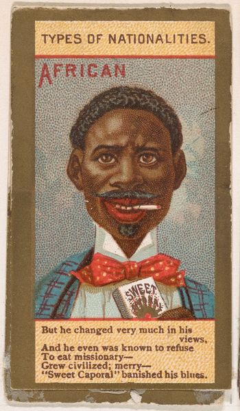 Editor: Here we have a lithograph print, “Caricature of African, from World's Smokers series (N33) for Allen & Ginter Cigarettes,” dating to 1888. It’s a small portrait. The word “African” is printed right below the figure, almost like a label. It feels…awkwardly formal. What do you see in this piece? Curator: It's part of a larger series that tells us a lot about the late 19th century, a period rife with expansionism and burgeoning consumer culture. These cards were essentially advertisements slipped into cigarette packs. Consider the context: they aimed to associate smoking with sophistication and global appeal. This particular card reflects the exoticized and often stereotyped imagery that was circulated to promote this idea of worldly knowledge and social aspiration. Editor: So, it's not just about smoking but about selling an image of the world? The Ukiyo-e style feels almost contradictory to the caricature. Curator: Exactly. The card borrows stylistic elements – the flatness, the clean lines – but it uses them to depict what was perceived as "other." Ask yourself, what is the effect of placing this stereotype within an art form traditionally associated with elegance and refinement? Whose perspectives and assumptions are privileged here? It serves to highlight power dynamics. Editor: It really makes you think about how we got so used to this kind of imagery. Curator: Indeed. Examining these objects helps us understand the visual language of colonialism and how it permeated everyday life. Advertising like this actively constructed and reinforced cultural hierarchies. Editor: It’s uncomfortable, but important to understand. Curator: Precisely. And understanding its place within a wider culture, we are able to approach it critically, which I think is key here.