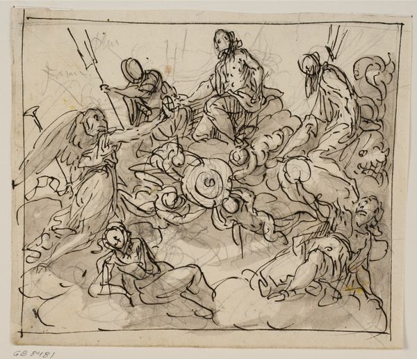 Curator: Gaspare Diziani’s “Death of the Virgin” is currently held here at the Städelsches Kunstinstitut. This study, composed of ink and chalk, gives us insight into his baroque sensibilities and figurations. Editor: It's haunting. The soft grey wash creates such a subdued and reverent atmosphere. You can almost feel the weight of the scene, the hush surrounding her deathbed. Curator: Absolutely. Diziani clearly wants us to focus on the spectacle. This was the artistic climate of his time, one designed to instill faith, a visual rhetoric which absolutely impacted his commission work as it was often used for religious and political reasons. Editor: It is the material quality I notice most here. The contrast between the delicate chalk lines defining the figures and the ink wash giving them form makes this scene especially powerful. The ephemeral medium mirrors the passing of life itself. And the way light appears to interact… Did he carefully choose paper stock to enhance it? Curator: He was certainly aware of his patron! Diziani was deeply connected to the art market. Remember, Venetian artists during his period frequently adapted their styles according to market trends, meaning their studios and choice of presentation were carefully attuned to attract the best offers from dealers or high ranking officers within the church. Editor: Still, there's something intrinsically vulnerable revealed through these raw materials. It bypasses some of that staging by showing how things were actually handled during the studio process; it grounds the miraculous elements, that light and gesture, with what goes into making such depictions believable. Curator: What's so striking is the staging; her final passing surrounded by sorrowful disciples… I am compelled by how it all contributed toward the narratives presented to a public keen on seeing displays of emotion and grandeur during this time. Editor: For me, I’m stuck on how Diziani translated the divine through very earthly materials; chalk, ink, paper. The process, even in its initial sketched stages, imbues the subject with tangible humanity and evokes profound contemplation. Curator: Viewing the finality of death in those times reminds us of a period where image making carried substantial social power. It encourages discourse about power dynamics existing even within creative spheres! Editor: And by paying attention to materials, we begin seeing how these political, historical factors are brought to life through artistic skill and craftsmanship. What a privilege to share such observations with our audience.