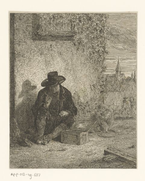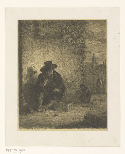 Curator: What a melancholic scene. There’s such an air of isolation to it. Editor: That's what I find interesting about "Man met hoed gezeten op de hoek van een straat bij een kist en aap," dating between 1825 and 1863 and currently held in the Rijksmuseum. Look closely, it is an engraving, a print really, crafted by Guillaume Joseph Vertommen. The sheer labor involved in creating that fine detail… Curator: Absolutely. Think of the street scenes Vertommen would have observed, sketching surreptitiously perhaps, considering the social standing afforded artists then, observing this individual with his ape and box… I wonder about the performance. Editor: Yes, performance. And perhaps economic hardship. We see an itinerant entertainer, plying his trade at the whim of passersby. It speaks to the underclass and the means by which individuals existed, scraping together resources. Curator: But what of the production? Vertommen uses etching to such a realist conclusion. He had a strong comprehension of light, particularly given how well the detail stands out within such stark monochrome. And why the hat, do you think? Editor: The hat could symbolize his trade, his role in the public sphere. And beyond the symbolism is the material culture: where did he buy his clothes, how were they produced, by whom, under what circumstances? Think of the networks of production, exploitation even. Curator: All framed by this idea of public spectacle, what did seeing such a man represent? Was it a commonplace experience, an outlier even, depending on the economic landscape in urban locations? Editor: Indeed. By examining the artwork we glean insight into systems of labor and economy… things as basic and poignant as survival within communities that may, or may not, support it. Curator: A humbling slice of historical narrative beautifully immortalized by Vertommen's expert touch. Editor: Yes. The materials and processes tell more than the immediate visual suggests.